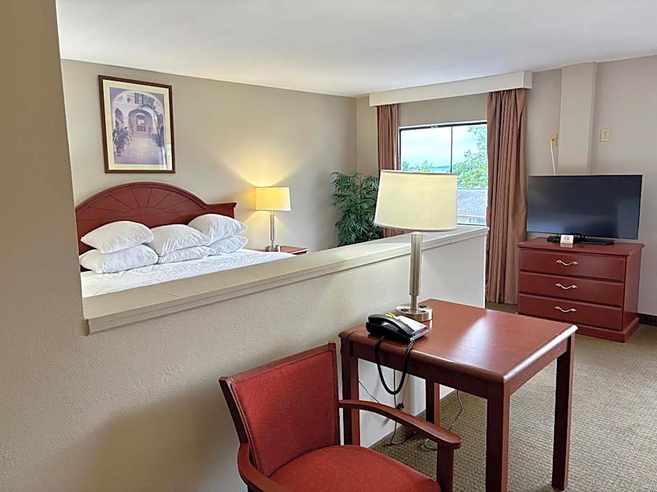 This nonsmoking king business class suite includes a desk, chair, microwave, fridge, sitting area and a sofa bed.