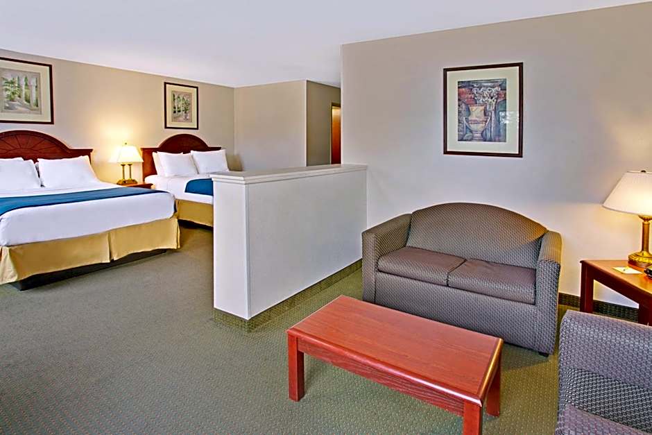 This double queen suite features a microwave and refrigerator, desk and chair.