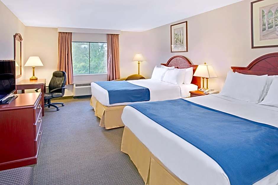 This double queen room features a microwave, refrigerator, desk and chair.